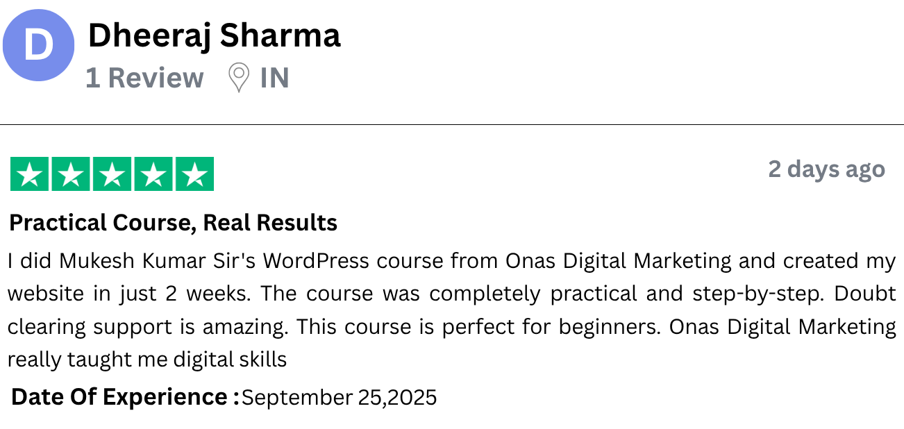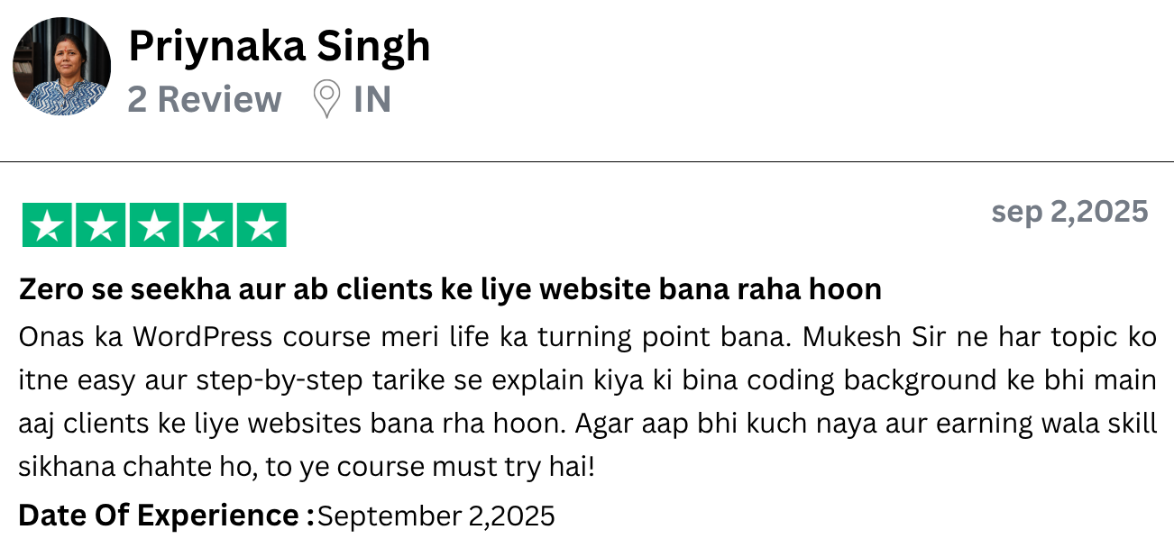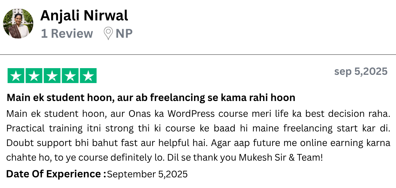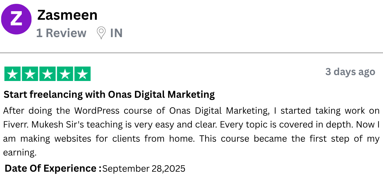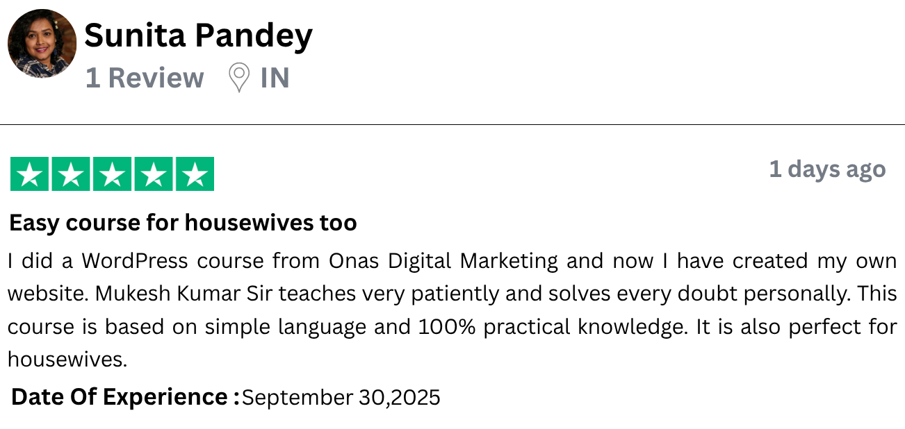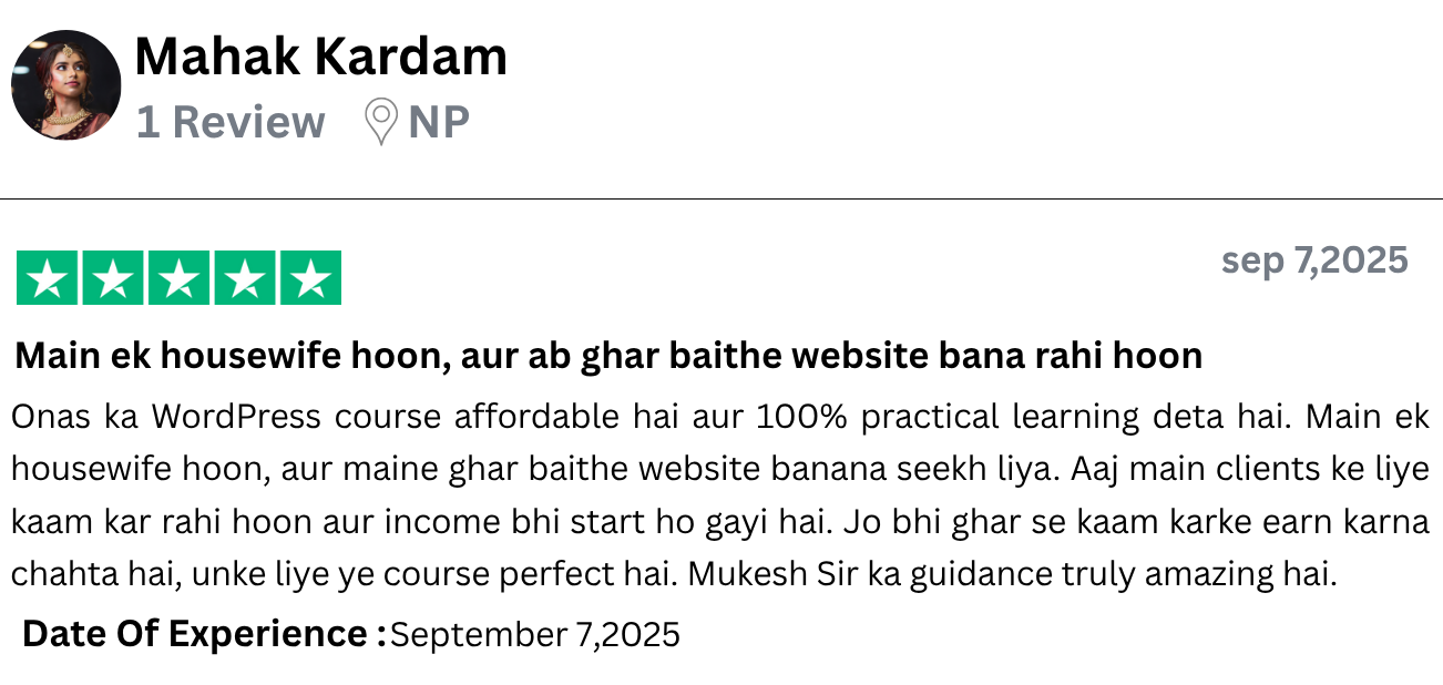 I have started freelancing after learning WordPress from Onas Digital Marketing. I am a housewife and do not come from a technical background, yet I built a complete website. What Mukesh Sir taught was practical, clear and easy. The course is affordable but the value is very high. I would definitely recommend all women to do this course.