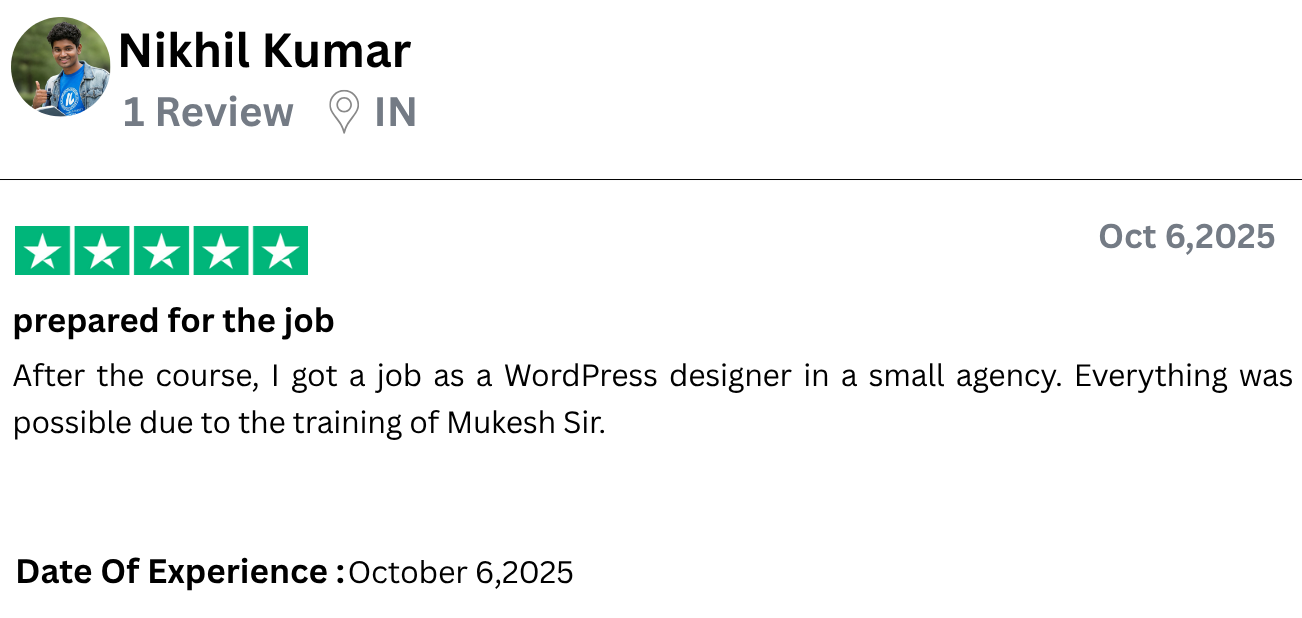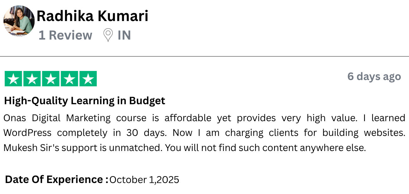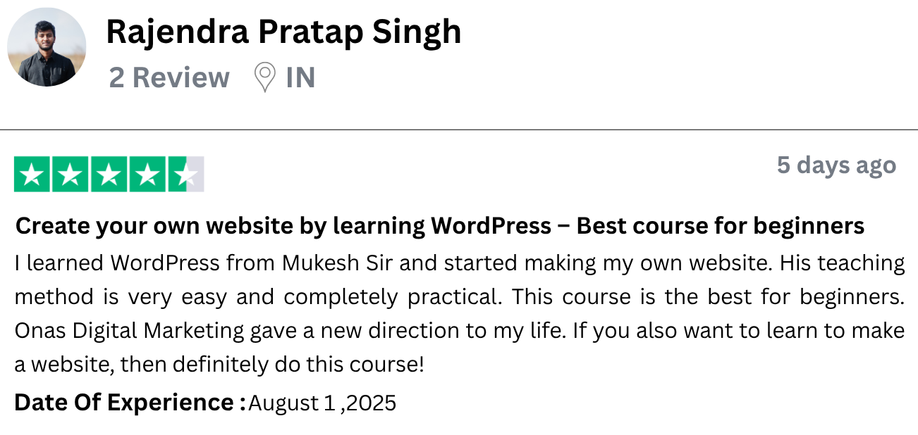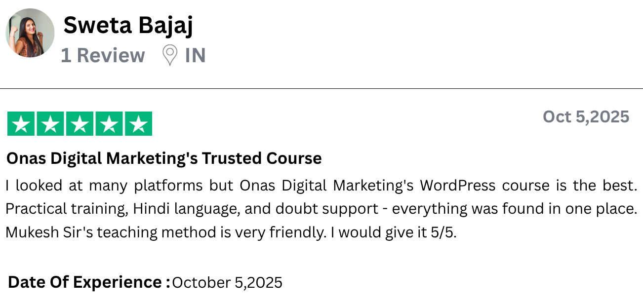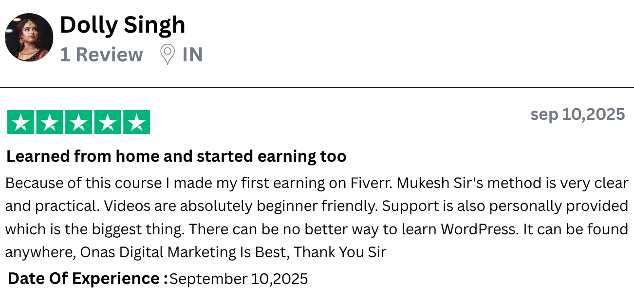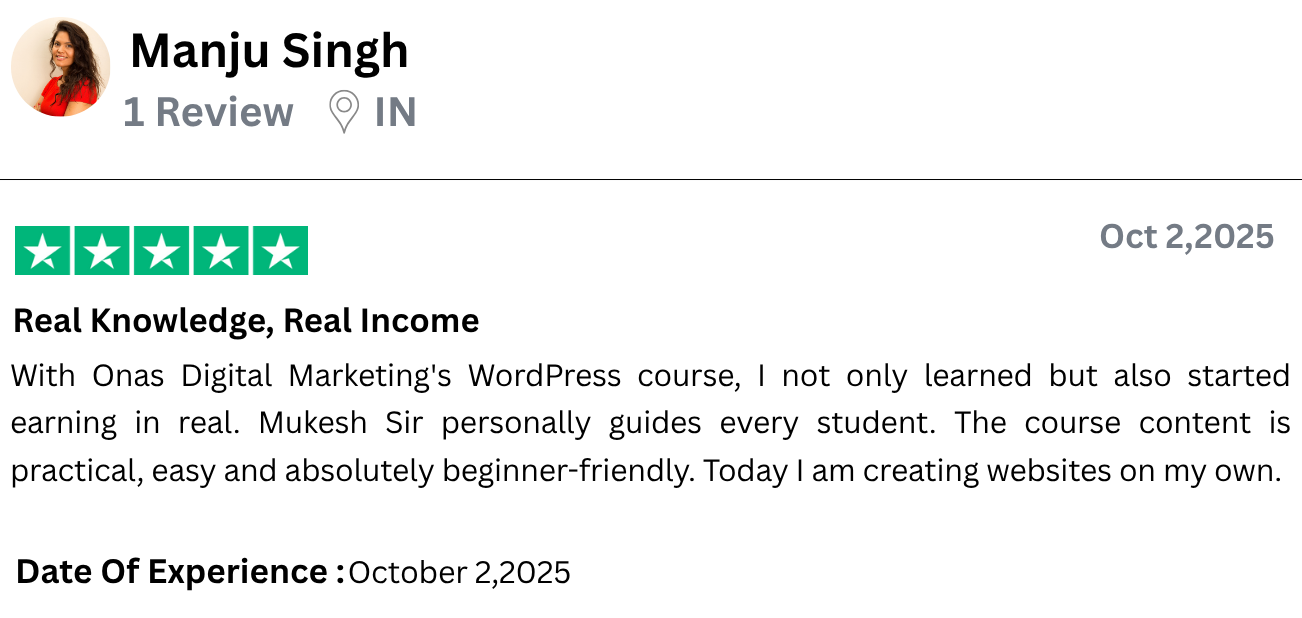 I have started freelancing after learning WordPress from Onas Digital Marketing. I am a housewife and do not come from a technical background, yet I built a complete website. What Mukesh Sir taught was practical, clear and easy. The course is affordable but the value is very high. I would definitely recommend all women to do this course.